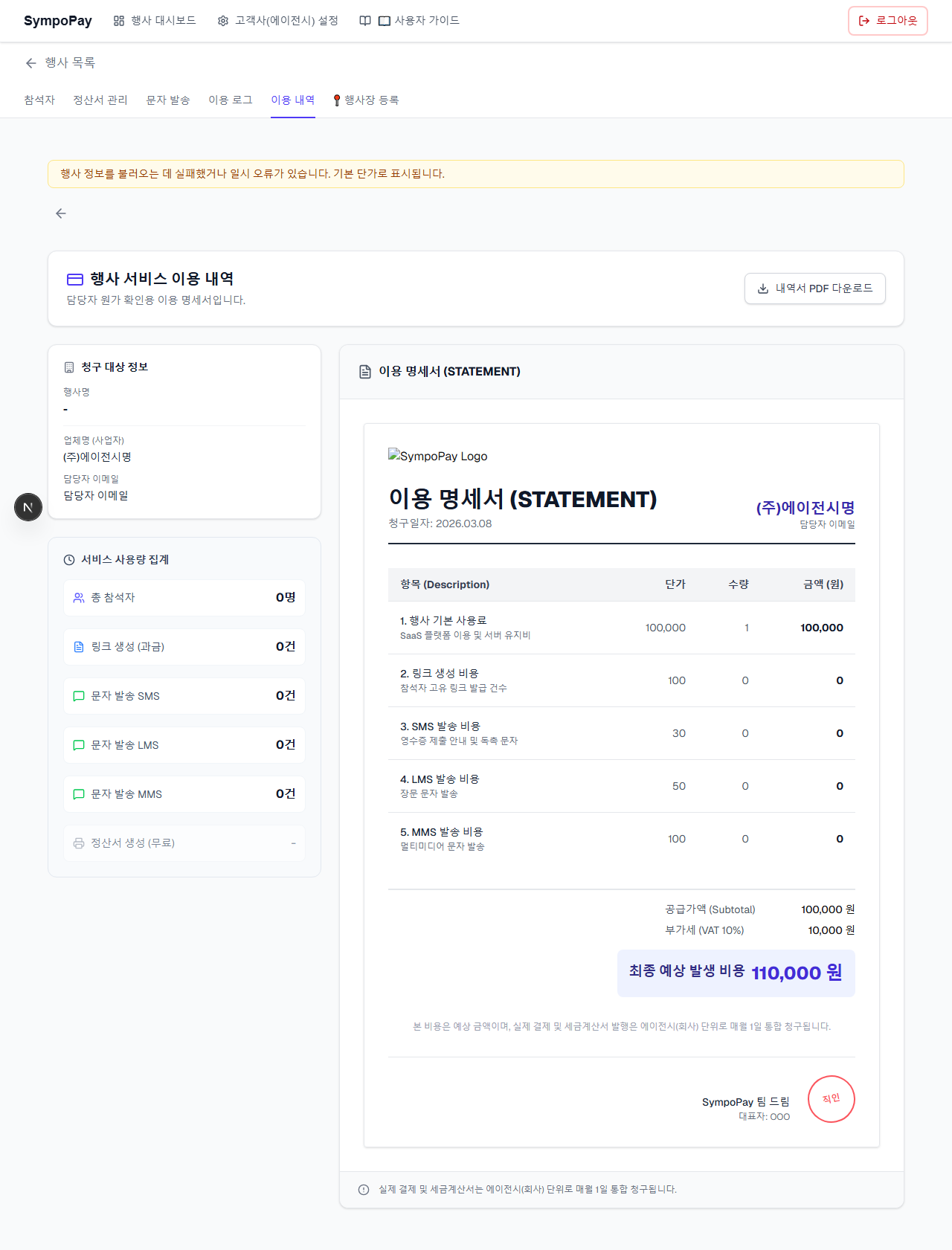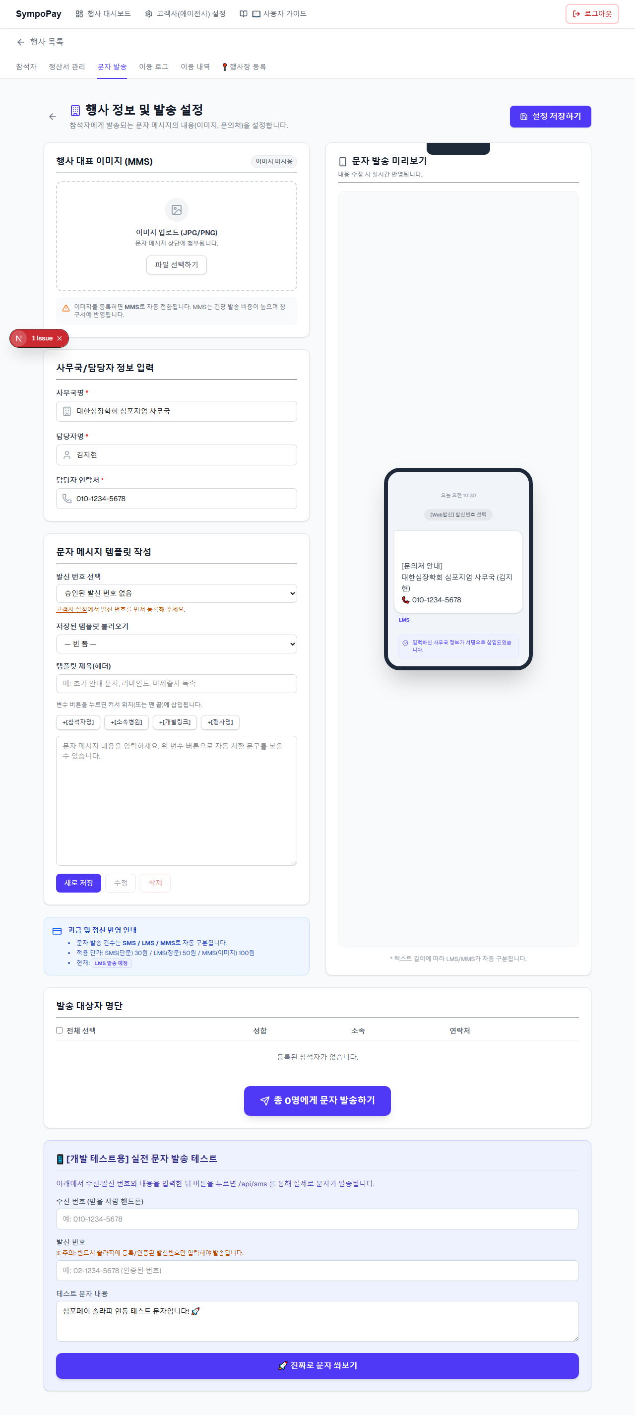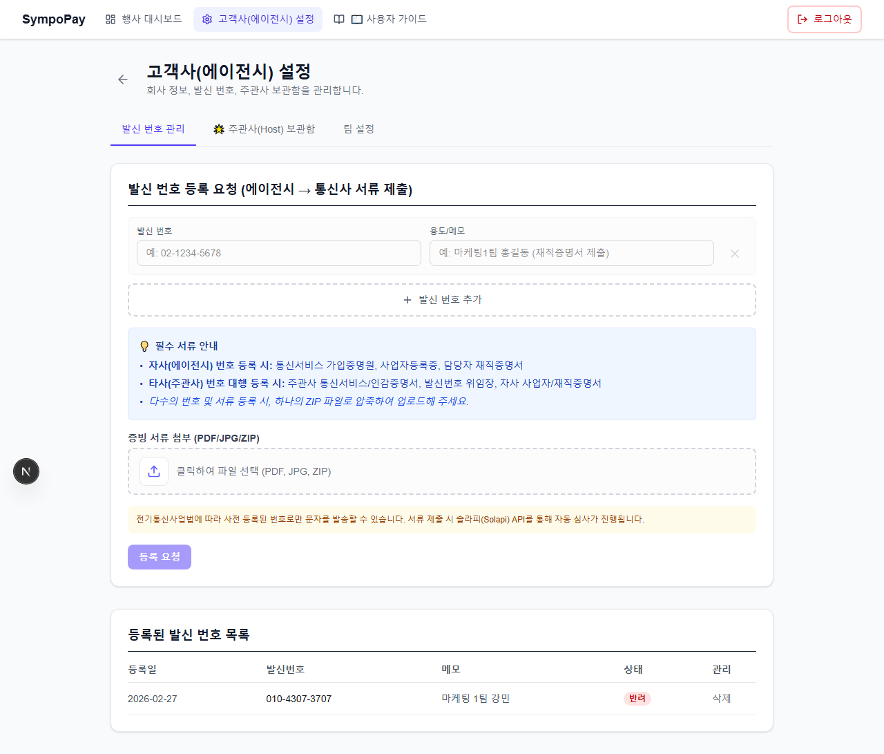 처음 SympoPay를 사용하시는 경우, 상단 메뉴에서 고객사(에이전시) 설정으로 들어가 발신 번호, 주관사(학회·제약사 등), 담당 팀을 미리 등록해 두세요. 행사를 만들 때 주관사와 팀을 선택할 수 있으며, 참석자 제출 페이지에 주관사 로고가 노출됩니다.