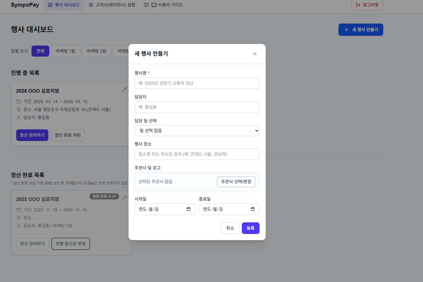 - 팀 설정: 마케팅 1팀, 영업팀 등 팀 이름을 추가해 행사별로 구분할 수 있습니다.