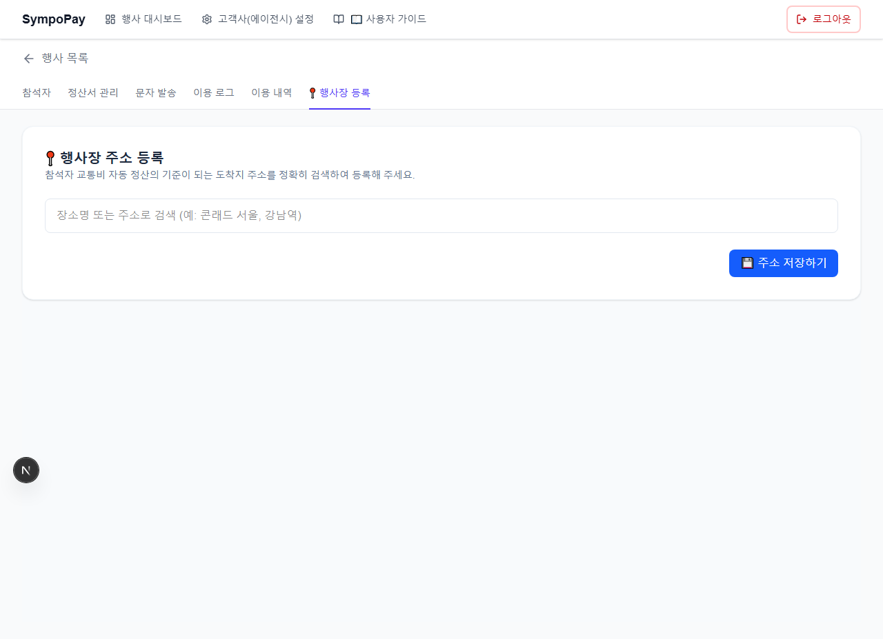 행사를 만든 뒤, 해당 행사 카드에서 정산 관리하기를 클릭해 들어간 다음 상단 탭 중 📍 행사장 등록을 선택하세요. 여기서 등록한 주소는 참석자별 교통비(네이버 지도 기준) 계산 시도착지로 사용됩니다. 반드시 검색으로 정확한 주소를 선택한 뒤 주소 저장하기를 눌러 주세요.