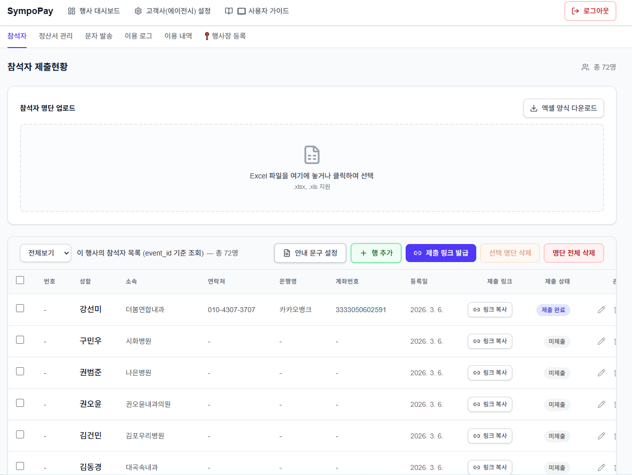 행사 상세의 참석자 탭에서 엑셀 양식을 다운로드한 뒤, 번호·성함·소속·연락처·은행명·계좌번호를 채워 업로드합니다. 참석자 저장을 누르면 명단이 반영되고, 제출 링크 발급 버튼을 클릭하면 참석자별 제출용 링크가 생성됩니다. 각 행의 링크 복사로 URL을 복사해 참석자에게 전달하세요.