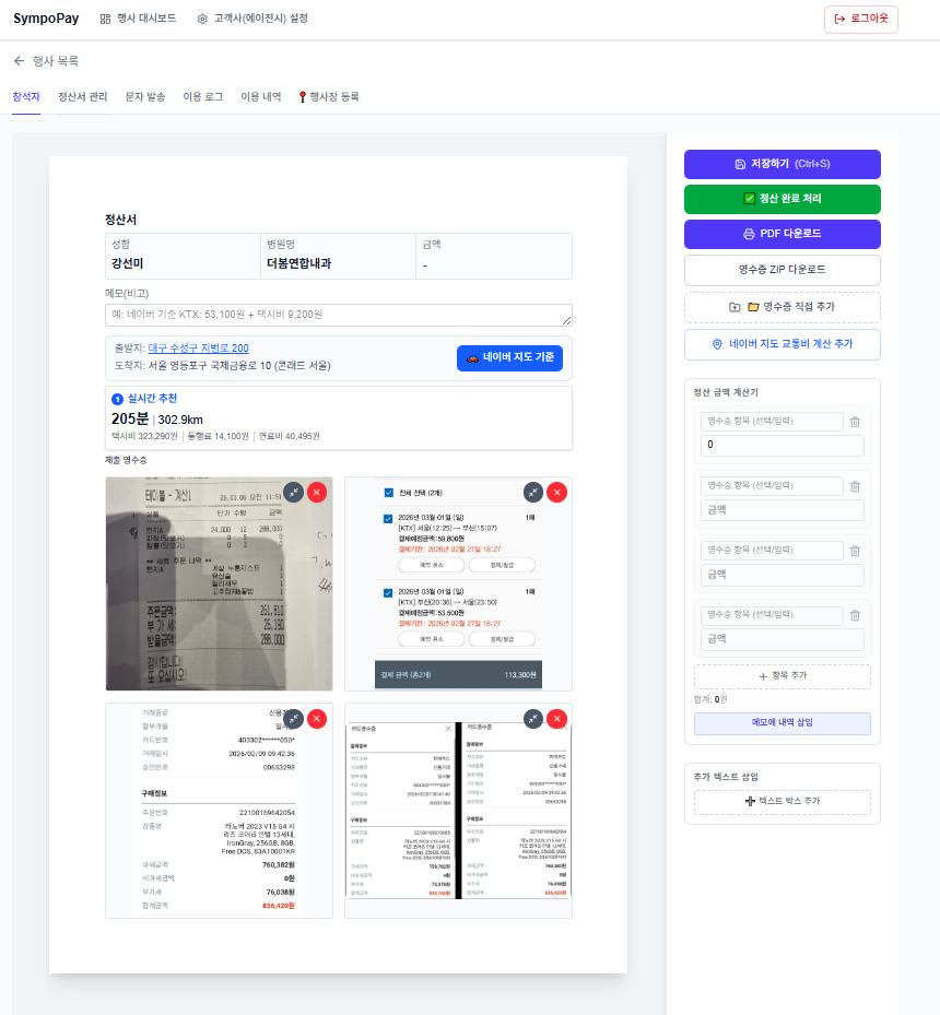 정산서 관리 탭에서 영수증을 제출한 참석자 목록을 볼 수 있습니다. 각 행의 정산서 작성을 클릭하면 해당 참석자의 정산서 편집 화면으로 이동합니다. 여기서 참석자 정보·메모를 수정하고, 제출된 영수증 순서를 바꾸거나 정산에서 제외할 수 있으며, 네이버 지도 교통비 계산 추가 후 출발지를 검색·선택하고🚗 네이버 지도 기준 버튼을 누르면 택시비·통행료·연료비가 자동으로 계산되어 정산서에 반영됩니다.